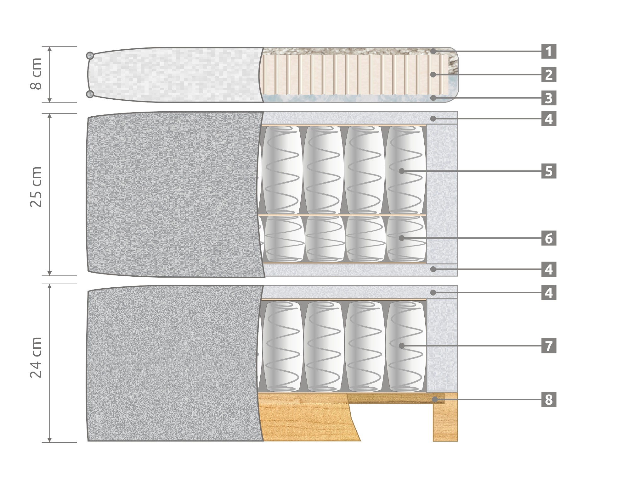 Topmadrassen NYBORG er 8 cm tyk og består af porøs Clima latex 4 cm, den er dækket på den ene side med et lag uld og på den anden side - med et lag bomuld. Uld og bomuld beskytter kroppen mod overophedning og forkølelse på forskellige tidspunkter af året. Derudover forbedrer Clima latex luftgennemtrængeligheden yderligere, giver elasticitet og modstand mod deformation.