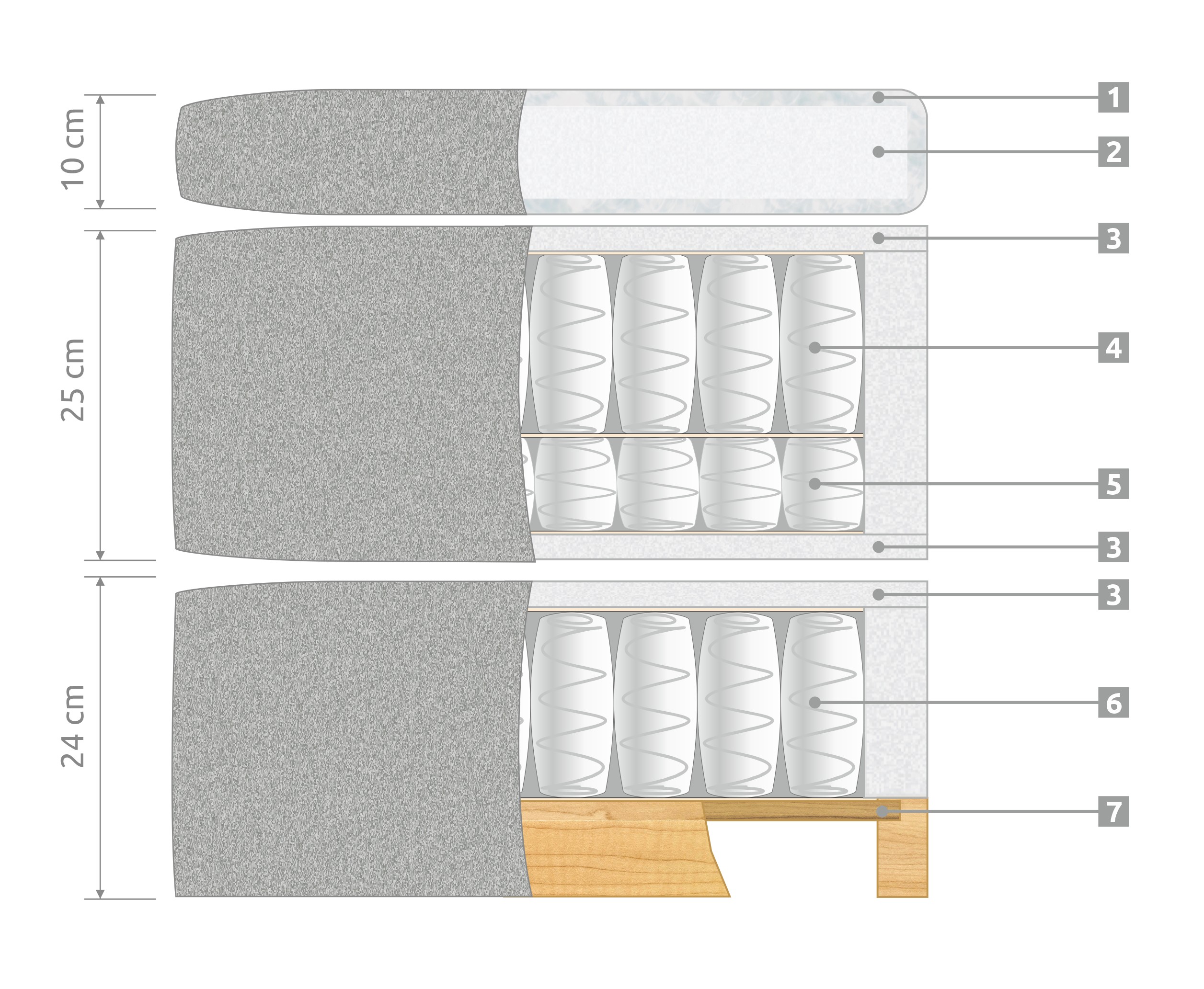 Vojens topmadrassen er 10 cm dyb. Den består af to hovedlag: vat og 8 cm skum, som du kan ændre til 8 cm HR-skum (Extra Soft) så du kan nyde en ekstremt blød komfort.